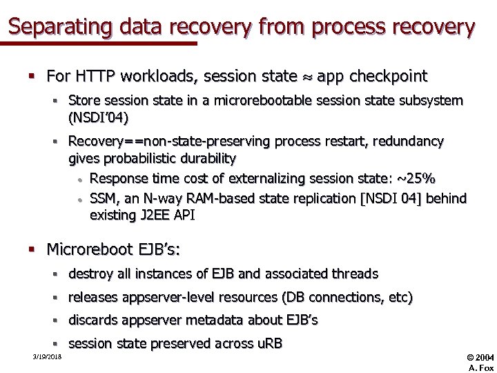 Separating data recovery from process recovery § For HTTP workloads, session state app checkpoint § Store session state in a microrebootable session state subsystem (NSDI’ 04) § Recovery==non-state-preserving process restart, redundancy gives probabilistic durability • Response time cost of externalizing session state: ~25% • SSM, an N-way RAM-based state replication [NSDI 04] behind existing J 2 EE API § Microreboot EJB’s: § destroy all instances of EJB and associated threads § releases appserver-level resources (DB connections, etc) § discards appserver metadata about EJB’s § session state preserved across u. RB 3/19/2018 © 2004 A. Fox
