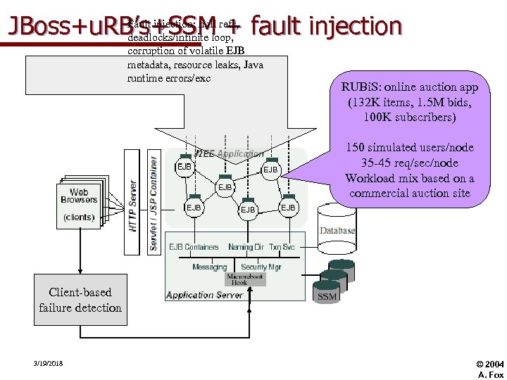 Fault injection: null JBoss+u. RB’s+SSM refs, fault injection + deadlocks/infinite loop, corruption of volatile EJB metadata, resource leaks, Java runtime errors/exc RUBi. S: online auction app (132 K items, 1. 5 M bids, 100 K subscribers) 150 simulated users/node 35 -45 req/sec/node Workload mix based on a commercial auction site Client-based failure detection 3/19/2018 © 2004 A. Fox