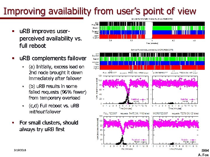 Improving availability from user’s point of view § u. RB improves userperceived availability vs. full reboot § u. RB complements failover § (a) Initially, excess load on 2 nd node brought it down immediately after failover § (b) u. RB results in some failed requests (96% fewer) from temporary overload § (c, d) Full reboot vs. u. RB without failover § For small clusters, should always try u. RB first 3/19/2018 © 2004 A. Fox