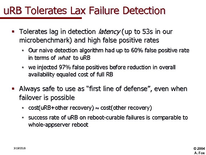 u. RB Tolerates Lax Failure Detection § Tolerates lag in detection latency (up to 53 s in our microbenchmark) and high false positive rates § Our naive detection algorithm had up to 60% false positive rate in terms of what to u. RB § we injected 97% false positives before reduction in overall availability equaled cost of full RB § Always safe to use as “first line of defense”, even when failover is possible § cost(u. RB+other recovery) cost(other recovery) § success rate of u. RB on reboot-curable failures is comparable to whole-appserver reboot 3/19/2018 © 2004 A. Fox