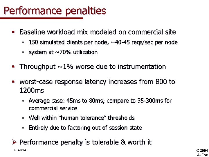 Performance penalties § Baseline workload mix modeled on commercial site § 150 simulated clients per node, ~40 -45 reqs/sec per node § system at ~70% utilization § Throughput ~1% worse due to instrumentation § worst-case response latency increases from 800 to 1200 ms § Average case: 45 ms to 80 ms; compare to 35 -300 ms for commercial service § Well within “human tolerance” thresholds § Entirely due to factoring out of session state Ø Performance penalty is tolerable & worth it 3/19/2018 © 2004 A. Fox