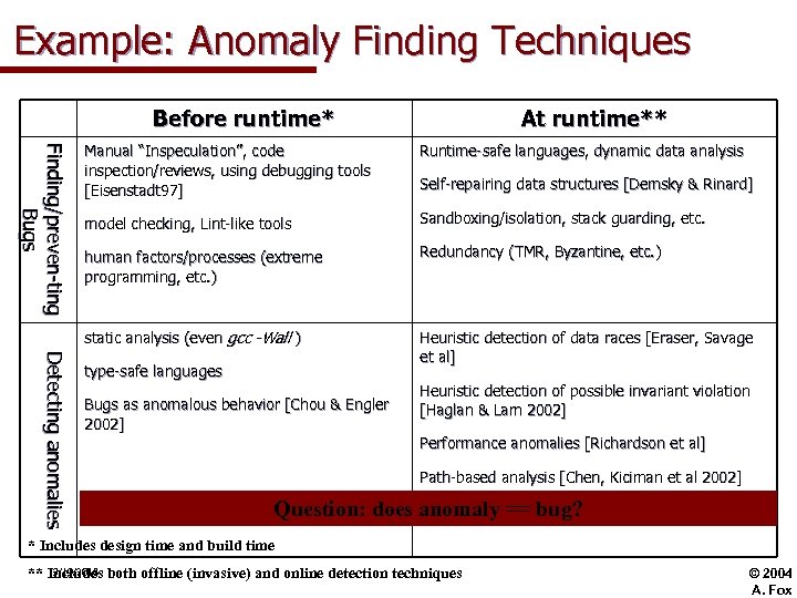 Example: Anomaly Finding Techniques Before runtime* At runtime** Detectiing anomalliies De t e c t n g a n o m a e s Runtime-safe languages, dynamic data analysis model checking, Lint-like tools Sandboxing/isolation, stack guarding, etc. human factors/processes (extreme programming, etc. ) Redundancy (TMR, Byzantine, etc. ) static analysis (even gcc -Wall ) Fiindiing/preven-tiing F n d n g / p r e ve n - t n g Bu g s Manual “Inspeculation”, code inspection/reviews, using debugging tools [Eisenstadt 97] Heuristic detection of data races [Eraser, Savage et al] type-safe languages Bugs as anomalous behavior [Chou & Engler 2002] Self-repairing data structures [Demsky & Rinard] Heuristic detection of possible invariant violation [Haglan & Lam 2002] Performance anomalies [Richardson et al] Path-based analysis [Chen, Kiciman et al 2002] Deadlock detection and Question: does anomaly == bug? repair * Includes design time and build time 3/19/2018 ** Includes both offline (invasive) and online detection techniques © 2004 A. Fox