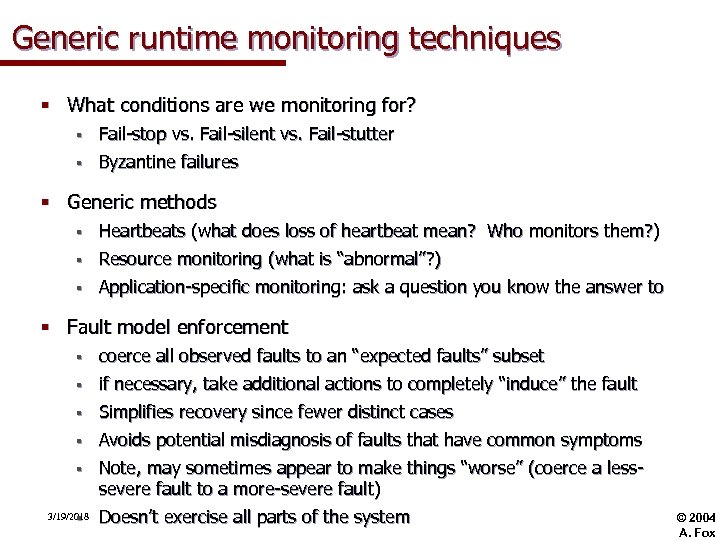 Generic runtime monitoring techniques § What conditions are we monitoring for? § Fail-stop vs. Fail-silent vs. Fail-stutter § Byzantine failures § Generic methods § Heartbeats (what does loss of heartbeat mean? Who monitors them? ) § Resource monitoring (what is “abnormal”? ) § Application-specific monitoring: ask a question you know the answer to § Fault model enforcement § coerce all observed faults to an “expected faults” subset § if necessary, take additional actions to completely “induce” the fault § Simplifies recovery since fewer distinct cases § Avoids potential misdiagnosis of faults that have common symptoms § Note, may sometimes appear to make things “worse” (coerce a lesssevere fault to a more-severe fault) 3/19/2018 § Doesn’t exercise all parts of the system © 2004 A. Fox