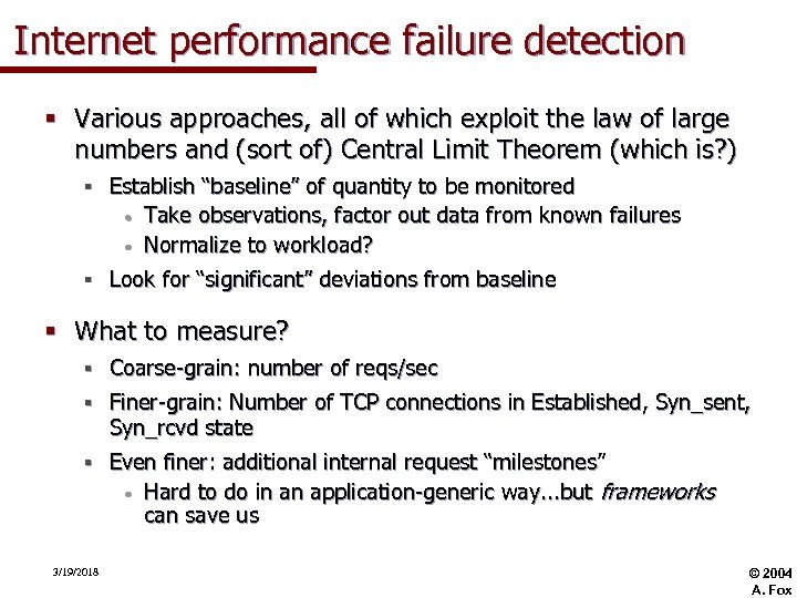 Internet performance failure detection § Various approaches, all of which exploit the law of large numbers and (sort of) Central Limit Theorem (which is? ) § Establish “baseline” of quantity to be monitored • Take observations, factor out data from known failures • Normalize to workload? § Look for “significant” deviations from baseline § What to measure? § Coarse-grain: number of reqs/sec § Finer-grain: Number of TCP connections in Established, Syn_sent, Syn_rcvd state § Even finer: additional internal request “milestones” • Hard to do in an application-generic way. . . but frameworks can save us 3/19/2018 © 2004 A. Fox