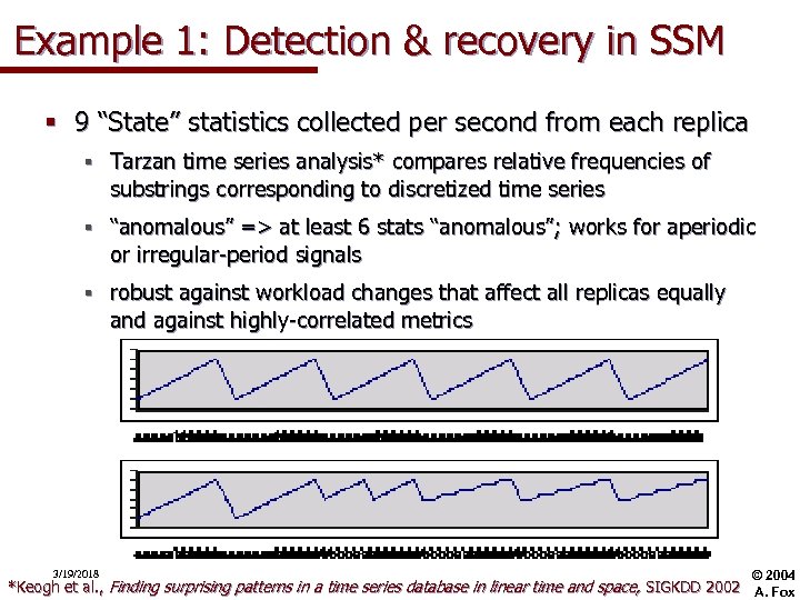 Example 1: Detection & recovery in SSM § 9 “State” statistics collected per second from each replica § Tarzan time series analysis* compares relative frequencies of substrings corresponding to discretized time series § “anomalous” => at least 6 stats “anomalous”; works for aperiodic or irregular-period signals § robust against workload changes that affect all replicas equally and against highly-correlated metrics 3/19/2018 © 2004 *Keogh et al. , Finding surprising patterns in a time series database in linear time and space, SIGKDD 2002 A. Fox