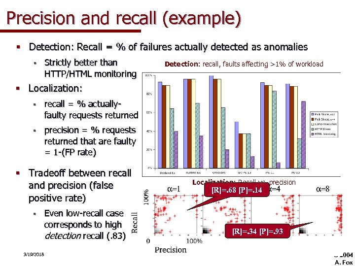 Precision and recall (example) § Detection: Recall = % of failures actually detected as anomalies § Strictly better than HTTP/HTML monitoring Detection: recall, faults affecting >1% of workload § Localization: § recall = % actuallyfaulty requests returned § precision = % requests returned that are faulty = 1 -(FP rate) § Tradeoff between recall and precision (false positive rate) § 3/19/2018 Even low-recall case corresponds to high detection recall (. 83) Localization: Recall vs. precision [R]=. 68 [P]=. 14 [R]=. 34 [P]=. 93 © 2004 A. Fox