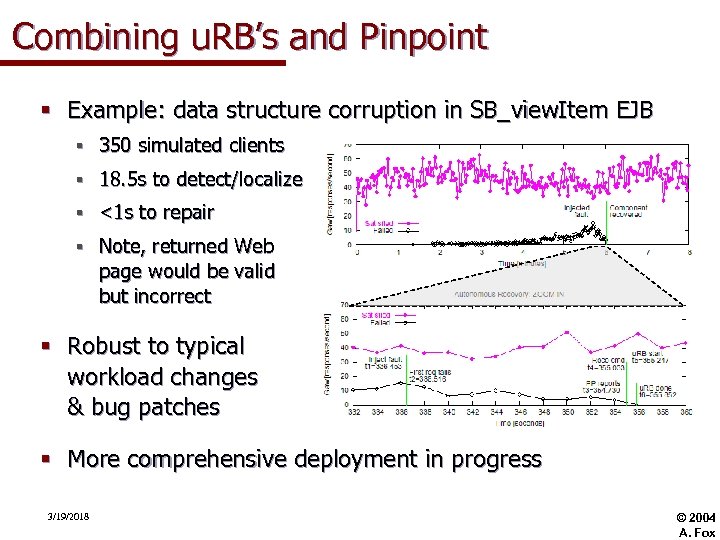 Combining u. RB’s and Pinpoint § Example: data structure corruption in SB_view. Item EJB § 350 simulated clients § 18. 5 s to detect/localize § <1 s to repair § Note, returned Web page would be valid but incorrect § Robust to typical workload changes & bug patches § More comprehensive deployment in progress 3/19/2018 © 2004 A. Fox