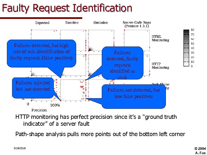 Faulty Request Identification HTTP monitoring has perfect precision since it’s a “ground truth indicator” of a server fault Path-shape analysis pulls more points out of the bottom left corner 3/19/2018 © 2004 A. Fox