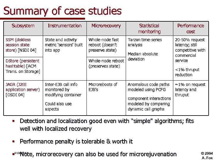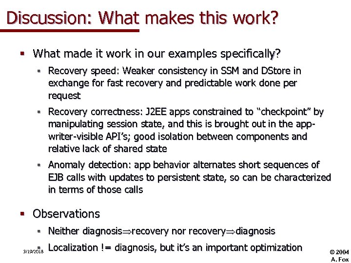 Discussion: What makes this work? § What made it work in our examples specifically? § Recovery speed: Weaker consistency in SSM and DStore in exchange for fast recovery and predictable work done per request § Recovery correctness: J 2 EE apps constrained to “checkpoint” by manipulating session state, and this is brought out in the appwriter-visible API’s; good isolation between components and relative lack of shared state § Anomaly detection: app behavior alternates short sequences of EJB calls with updates to persistent state, so can be characterized in terms of those calls § Observations § Neither diagnosis recovery nor recovery diagnosis § Localization != diagnosis, but it’s an important optimization 3/19/2018 © 2004 A. Fox