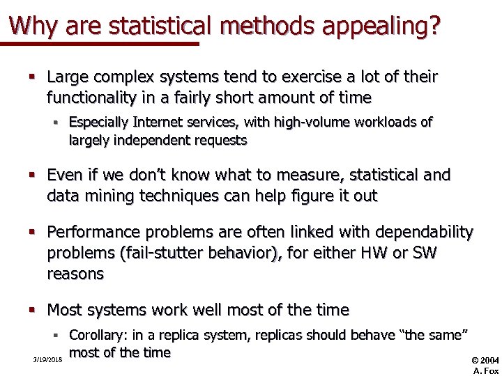 Why are statistical methods appealing? § Large complex systems tend to exercise a lot of their functionality in a fairly short amount of time § Especially Internet services, with high-volume workloads of largely independent requests § Even if we don’t know what to measure, statistical and data mining techniques can help figure it out § Performance problems are often linked with dependability problems (fail-stutter behavior), for either HW or SW reasons § Most systems work well most of the time § 3/19/2018 Corollary: in a replica system, replicas should behave “the same” most of the time © 2004 A. Fox