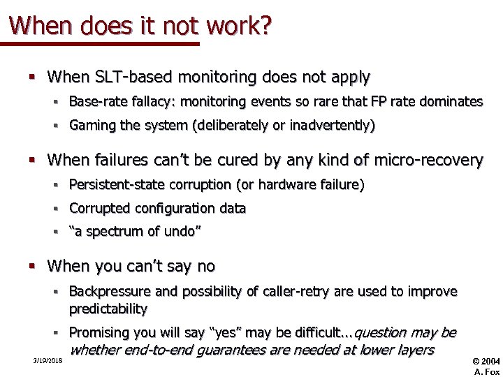 When does it not work? § When SLT-based monitoring does not apply § Base-rate fallacy: monitoring events so rare that FP rate dominates § Gaming the system (deliberately or inadvertently) § When failures can’t be cured by any kind of micro-recovery § Persistent-state corruption (or hardware failure) § Corrupted configuration data § “a spectrum of undo” § When you can’t say no § Backpressure and possibility of caller-retry are used to improve predictability § Promising you will say “yes” may be difficult. . . question may be 3/19/2018 whether end-to-end guarantees are needed at lower layers © 2004 A. Fox