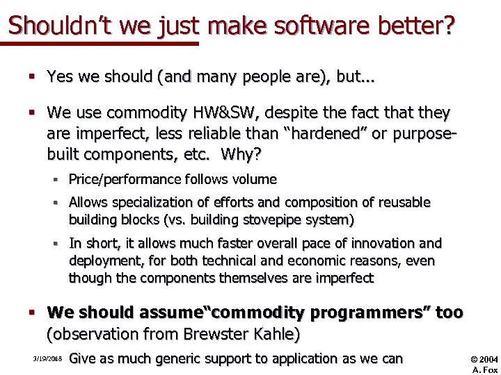 Shouldn’t we just make software better? § Yes we should (and many people are), but. . . § We use commodity HW&SW, despite the fact that they are imperfect, less reliable than “hardened” or purposebuilt components, etc. Why? § Price/performance follows volume § Allows specialization of efforts and composition of reusable building blocks (vs. building stovepipe system) § In short, it allows much faster overall pace of innovation and deployment, for both technical and economic reasons, even though the components themselves are imperfect § We should assume“commodity programmers” too (observation from Brewster Kahle) § 3/19/2018 Give as much generic support to application as we can © 2004 A. Fox