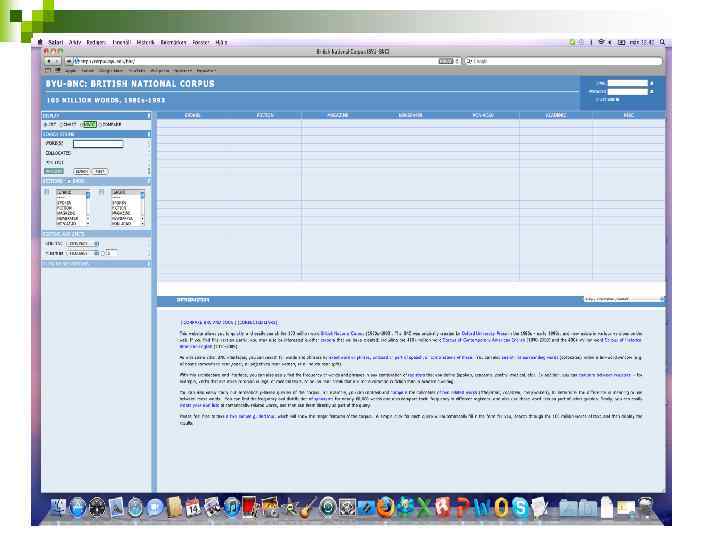 Linguistic Corpora Ø Brown Corpus. Ø Ø Ø Ланкастерский корпус английского языка (Lancaster. Oslo-Bergen Corpus, LOB). British National Corpus. http: //www. natcorp. ox. ac. uk International Corpus of English. Bank of English. Scotch corpus Cobuild Corpus. Мангеймский корпус немецкого языка. Чешский национальный корпус. Уппсальский корпус русского языка. Национальный корпус русского языка. www. ruscorpora. ru Корпусы китайского, турецкого, эстонского, албанского и многих других языков