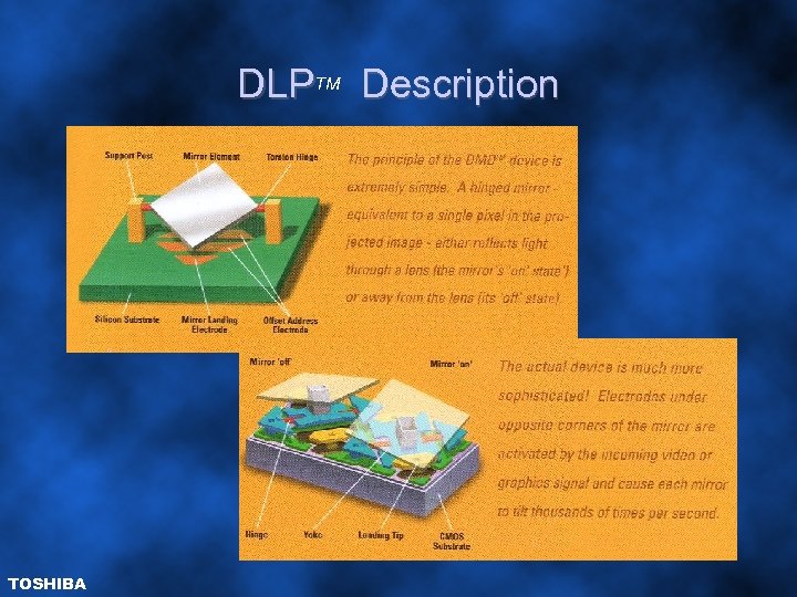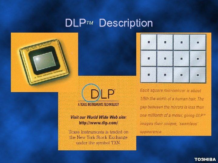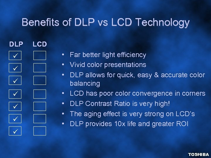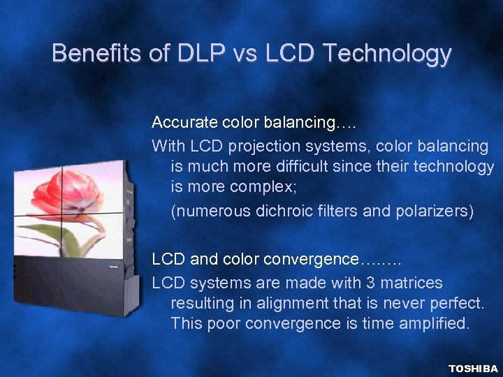 Benefits of DLP vs LCD Technology Accurate color balancing…. With LCD projection systems, color balancing is much more difficult since their technology is more complex; (numerous dichroic filters and polarizers) LCD and color convergence…. …. LCD systems are made with 3 matrices resulting in alignment that is never perfect. This poor convergence is time amplified. TOSHIBA