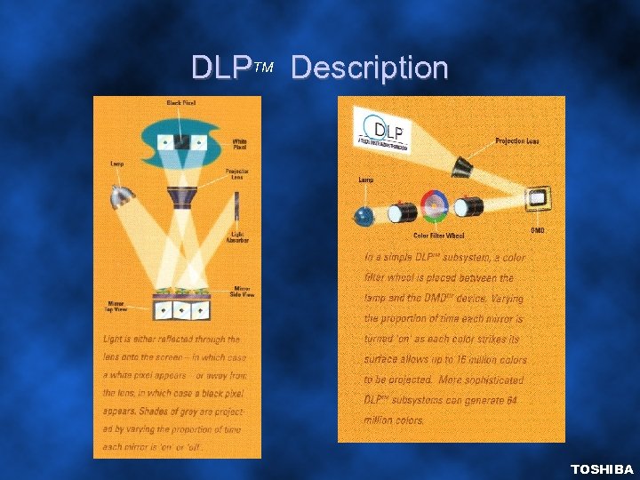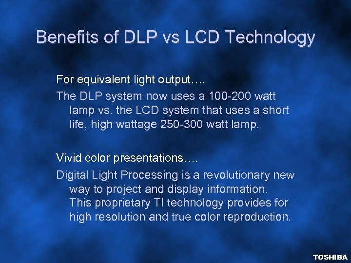 Benefits of DLP vs LCD Technology For equivalent light output…. The DLP system now uses a 100 -200 watt lamp vs. the LCD system that uses a short life, high wattage 250 -300 watt lamp. Vivid color presentations…. Digital Light Processing is a revolutionary new way to project and display information. This proprietary TI technology provides for high resolution and true color reproduction. TOSHIBA