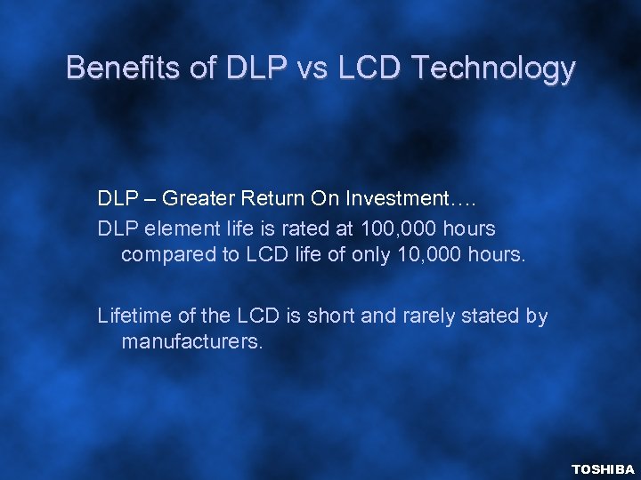 Benefits of DLP vs LCD Technology DLP – Greater Return On Investment…. DLP element life is rated at 100, 000 hours compared to LCD life of only 10, 000 hours. Lifetime of the LCD is short and rarely stated by manufacturers. TOSHIBA