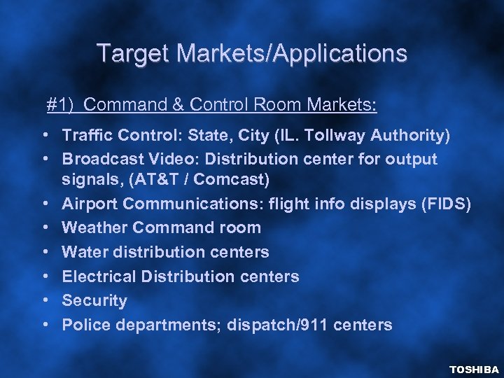 Target Markets/Applications #1) Command & Control Room Markets: • Traffic Control: State, City (IL. Tollway Authority) • Broadcast Video: Distribution center for output signals, (AT&T / Comcast) • Airport Communications: flight info displays (FIDS) • Weather Command room • Water distribution centers • Electrical Distribution centers • Security • Police departments; dispatch/911 centers TOSHIBA