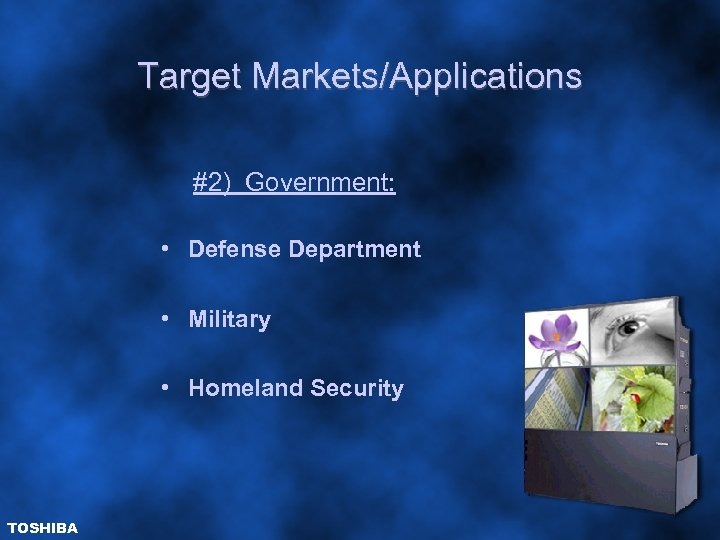Target Markets/Applications #2) Government: • Defense Department • Military • Homeland Security TOSHIBA