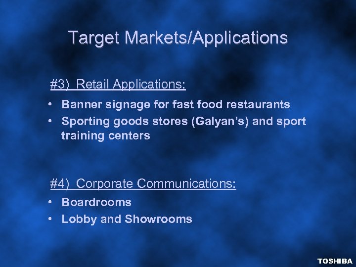 Target Markets/Applications #3) Retail Applications: • Banner signage for fast food restaurants • Sporting goods stores (Galyan’s) and sport training centers #4) Corporate Communications: • Boardrooms • Lobby and Showrooms TOSHIBA