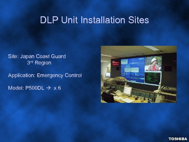DLP Unit Installation Sites Site: Japan Coast Guard 3 rd Region Application: Emergency Control Model: P 500 DL x 6 TOSHIBA
