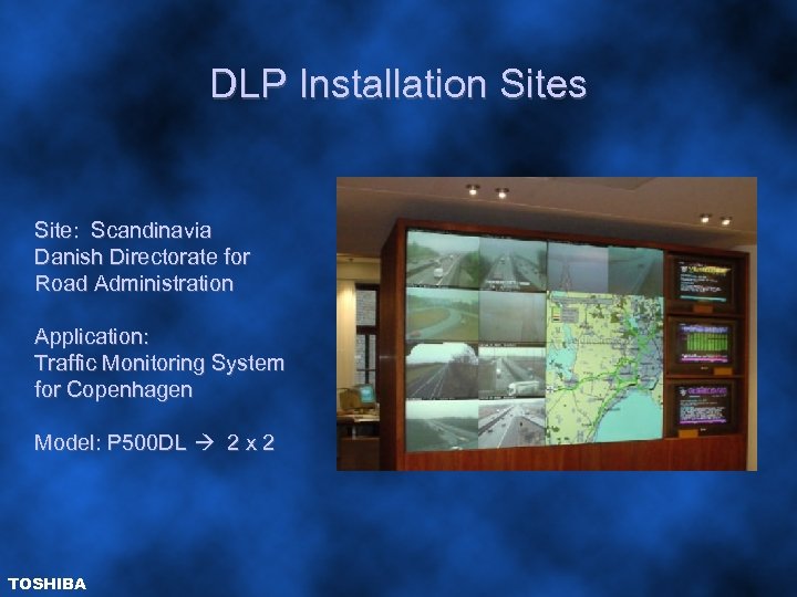 DLP Installation Sites Site: Scandinavia Danish Directorate for Road Administration Application: Traffic Monitoring System for Copenhagen Model: P 500 DL 2 x 2 TOSHIBA