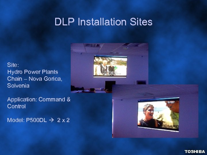 DLP Installation Sites Site: Hydro Power Plants Chain – Nova Gorica, Solvenia Application: Command & Control Model: P 500 DL 2 x 2 TOSHIBA
