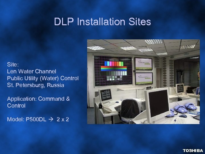 DLP Installation Sites Site: Len Water Channel Public Utility (Water) Control St. Petersburg, Russia Application: Command & Control Model: P 500 DL 2 x 2 TOSHIBA