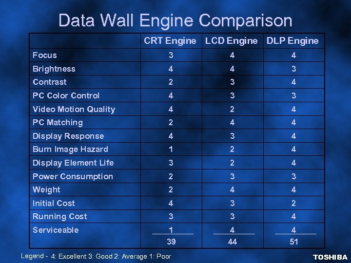Data Wall Engine Comparison CRT Engine LCD Engine DLP Engine Focus 3 4 4 Brightness 4 4 3 Contrast 2 3 4 PC Color Control 4 3 3 Video Motion Quality 4 2 4 PC Matching 2 4 4 Display Response 4 3 4 Burn Image Hazard 1 2 4 Display Element Life 3 2 4 Power Consumption 2 3 3 Weight 2 4 4 Initial Cost 4 3 2 Running Cost 3 3 4 Serviceable 1 39 4 44 4 51 Legend - 4: Excellent 3: Good 2: Average 1: Poor TOSHIBA