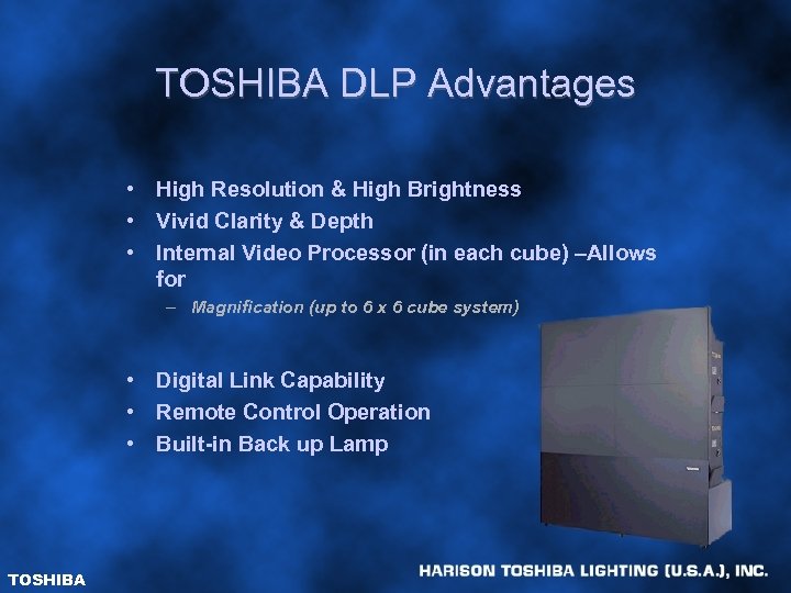 TOSHIBA DLP Advantages • High Resolution & High Brightness • Vivid Clarity & Depth • Internal Video Processor (in each cube) –Allows for – Magnification (up to 6 x 6 cube system) • Digital Link Capability • Remote Control Operation • Built-in Back up Lamp TOSHIBA