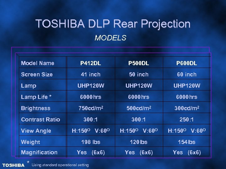 TOSHIBA DLP Rear Projection MODELS Model Name P 412 DL P 500 DL P 600 DL Screen Size 41 inch 50 inch 60 inch UHP 120 W Lamp Life * 6000 hrs Brightness 750 cd/m 2 500 cd/m 2 300: 1 250: 1 H: 150 O V: 60 O 198 lbs 120 lbs 154 lbs Yes (6 x 6) Lamp Contrast Ratio View Angle Weight Magnification TOSHIBA * Using standard operational setting
