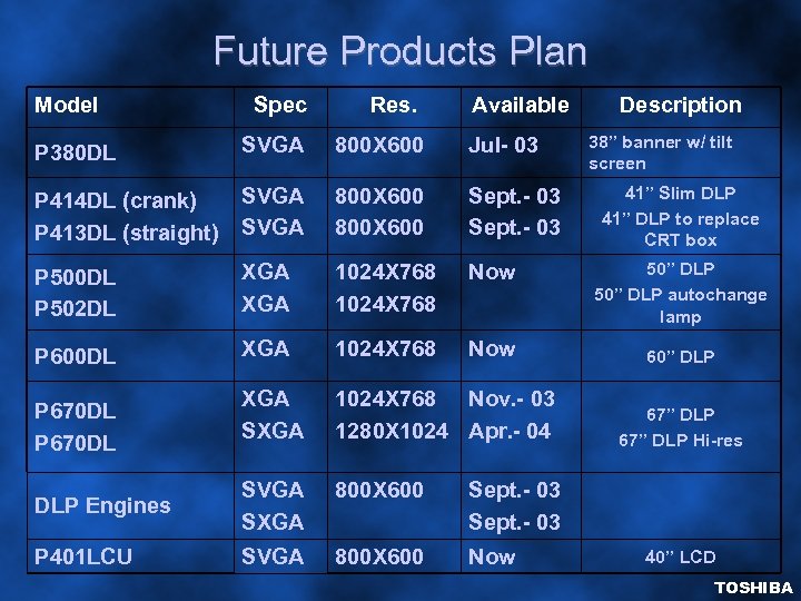 Future Products Plan Model Spec Res. Available P 380 DL SVGA 800 X 600 Jul- 03 P 414 DL (crank) P 413 DL (straight) SVGA 800 X 600 Sept. - 03 P 500 DL P 502 DL XGA 1024 X 768 Now P 600 DL XGA 1024 X 768 Now XGA SXGA 1024 X 768 Nov. - 03 1280 X 1024 Apr. - 04 DLP Engines SVGA SXGA 800 X 600 SVGA 800 X 600 Now 38” banner w/ tilt screen Sept. - 03 P 401 LCU Description P 670 DL 41” Slim DLP 41” DLP to replace CRT box 50” DLP autochange lamp 60” DLP 67” DLP Hi-res 40” LCD TOSHIBA