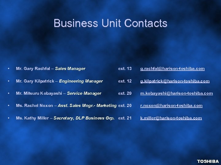 Business Unit Contacts • Mr. Gary Rachfal – Sales Manager ext. 13 g. rachfal@harison-toshiba. com • Mr. Gary Kilpatrick – Engineering Manager ext. 12 g. kilpatrick@harison-toshiba. com • Mr. Mitsuru Kobayashi – Service Manager ext. 29 m. kobayashi@harison-toshiba. com • Ms. Rachel Noxon – Asst. Sales Mngr. - Marketing ext. 20 r. noxon@harison-toshiba. com • Ms. Kathy Miller – Secretary, DLP Business Grp. ext. 21 k. miller@harison-toshiba. com TOSHIBA