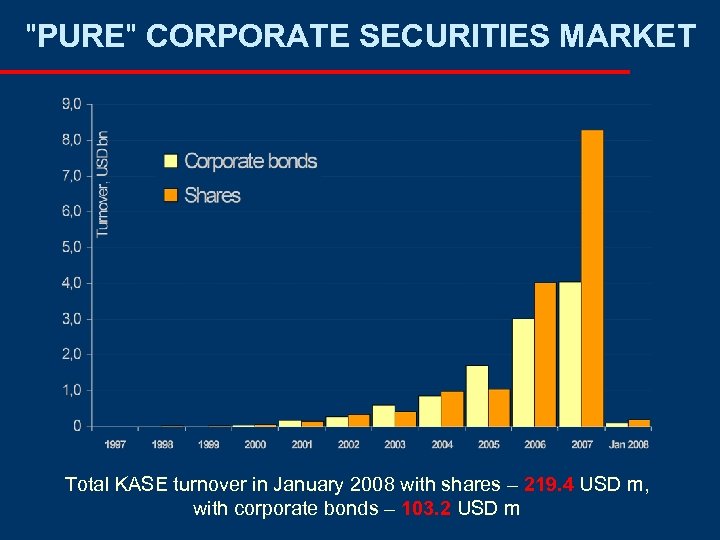 "PURE" CORPORATE SECURITIES MARKET Total KASE turnover in January 2008 with shares – 219. 4 USD m, with corporate bonds – 103. 2 USD m