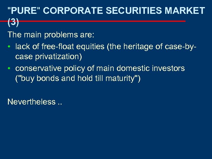 "PURE" CORPORATE SECURITIES MARKET (3) The main problems are: • lack of free-float equities (the heritage of case-bycase privatization) • conservative policy of main domestic investors ("buy bonds and hold till maturity") Nevertheless. .
