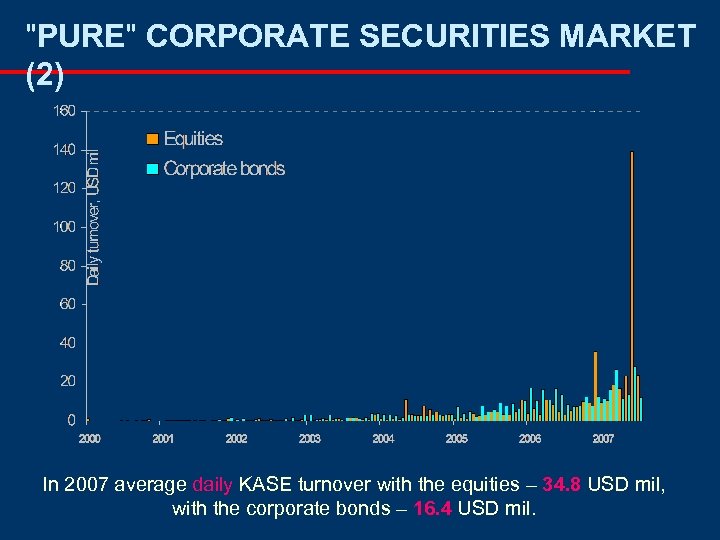 "PURE" CORPORATE SECURITIES MARKET (2) In 2007 average daily KASE turnover with the equities – 34. 8 USD mil, with the corporate bonds – 16. 4 USD mil.