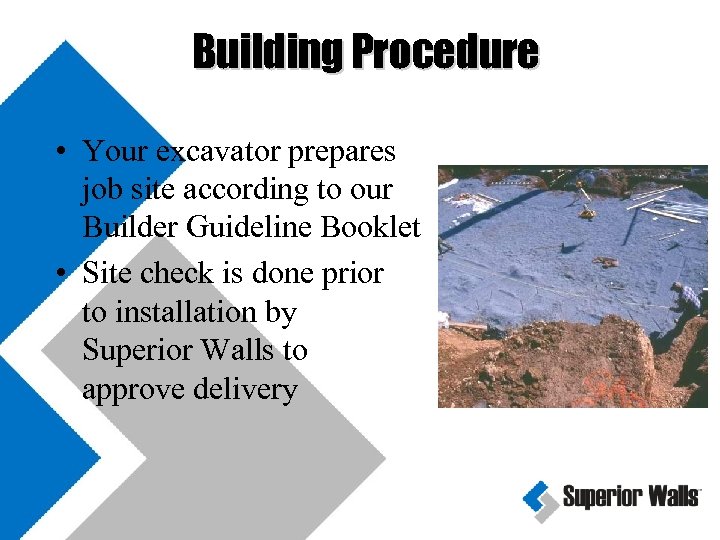 Building Procedure • Your excavator prepares job site according to our Builder Guideline Booklet • Site check is done prior to installation by Superior Walls to approve delivery