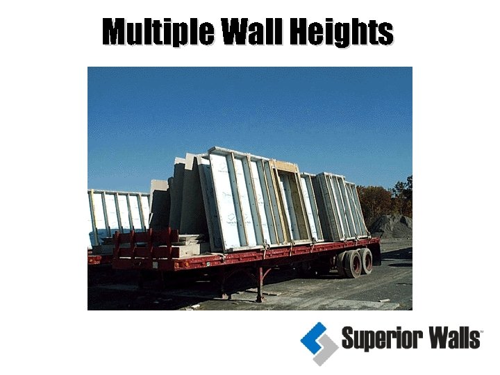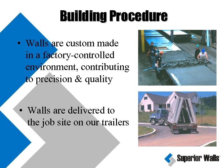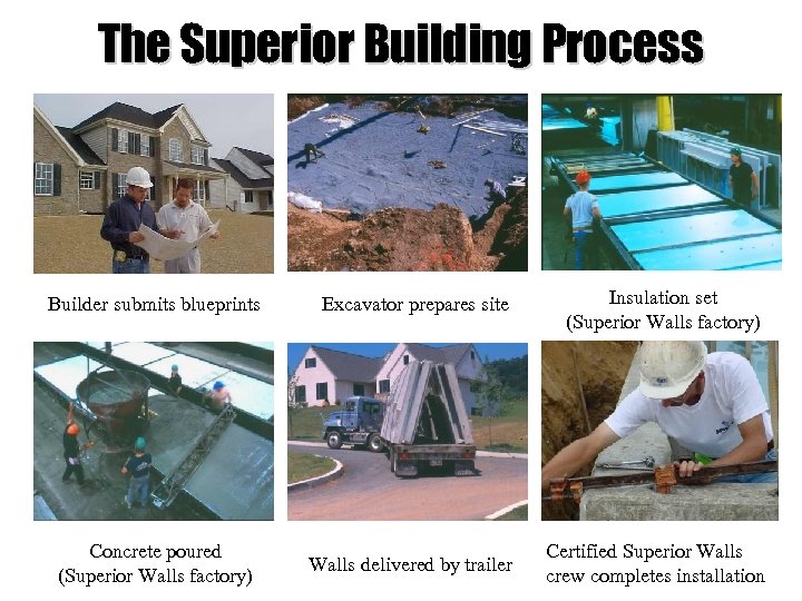 The Superior Building Process Builder submits blueprints Excavator prepares site Insulation set (Superior Walls factory) Concrete poured (Superior Walls factory) Walls delivered by trailer Certified Superior Walls crew completes installation