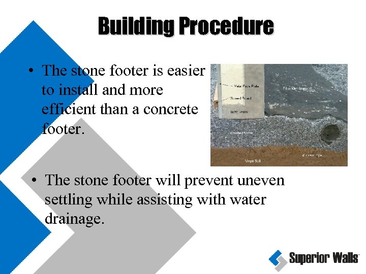 Building Procedure • The stone footer is easier to install and more efficient than a concrete footer. • The stone footer will prevent uneven settling while assisting with water drainage.