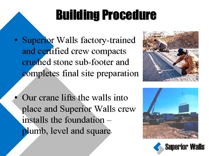 Building Procedure • Superior Walls factory-trained and certified crew compacts crushed stone sub-footer and completes final site preparation • Our crane lifts the walls into place and Superior Walls crew installs the foundation – plumb, level and square