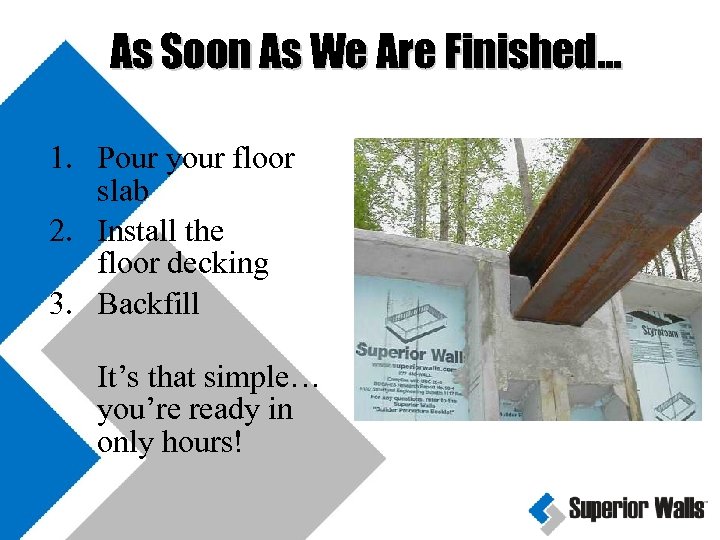 As Soon As We Are Finished… 1. Pour your floor slab 2. Install the floor decking 3. Backfill It’s that simple… you’re ready in only hours!