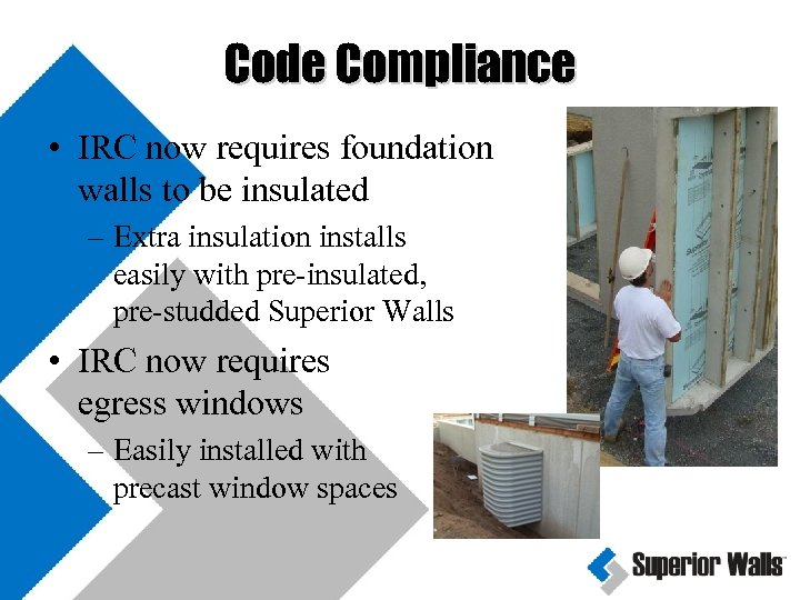Code Compliance • IRC now requires foundation walls to be insulated – Extra insulation installs easily with pre-insulated, pre-studded Superior Walls • IRC now requires egress windows – Easily installed with precast window spaces