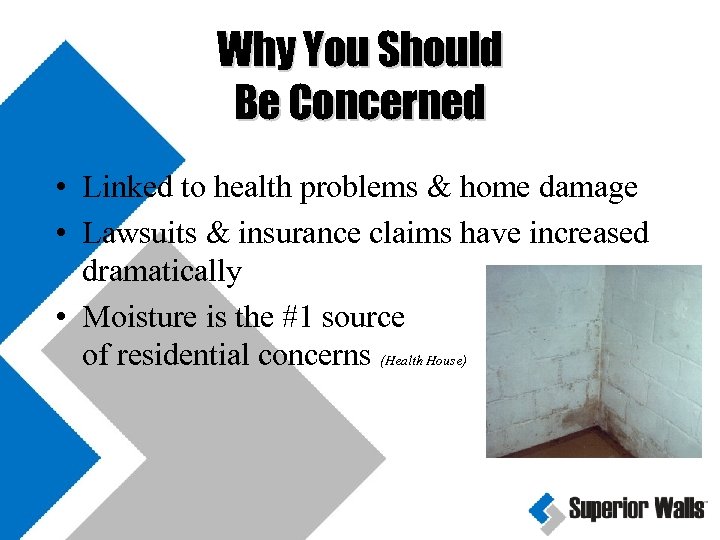 Why You Should Be Concerned • Linked to health problems & home damage • Lawsuits & insurance claims have increased dramatically • Moisture is the #1 source of residential concerns (Health House)
