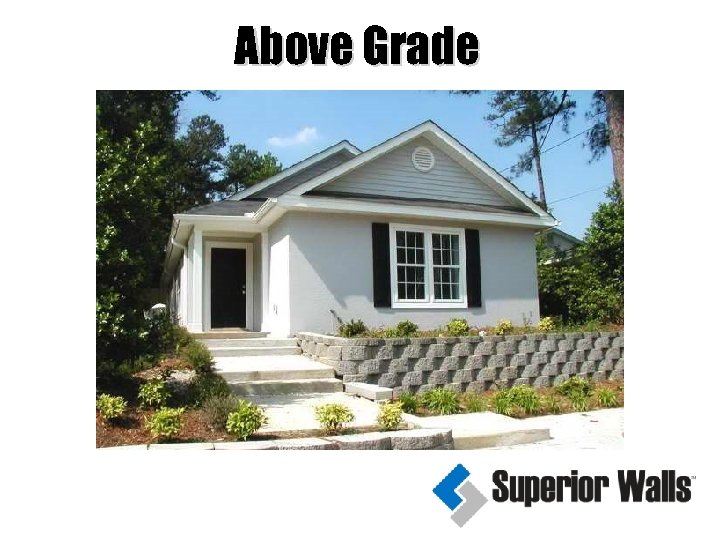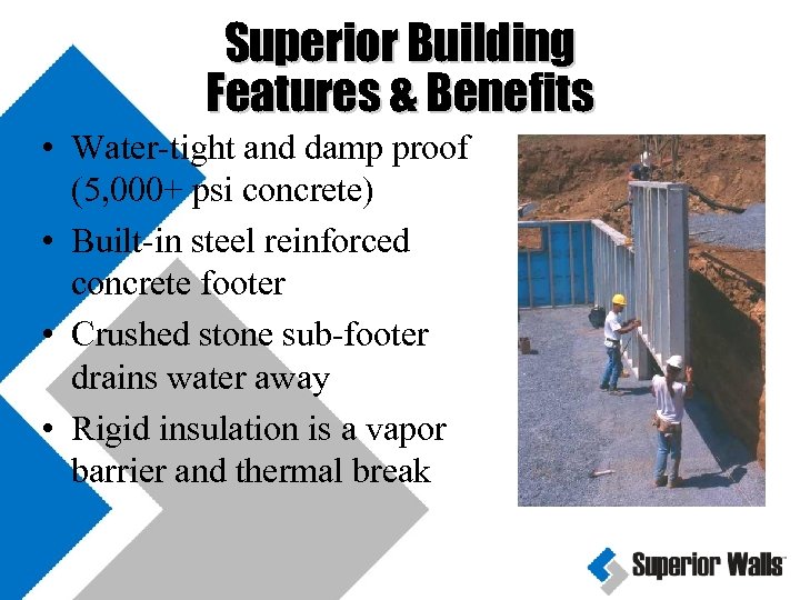Superior Building Features & Benefits • Water-tight and damp proof (5, 000+ psi concrete) • Built-in steel reinforced concrete footer • Crushed stone sub-footer drains water away • Rigid insulation is a vapor barrier and thermal break
