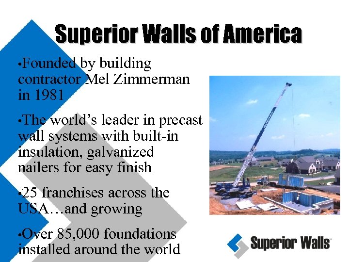 Superior Walls of America • Founded by building contractor Mel Zimmerman in 1981 • The world’s leader in precast wall systems with built-in insulation, galvanized nailers for easy finish • 25 franchises across the USA…and growing • Over 85, 000 foundations installed around the world