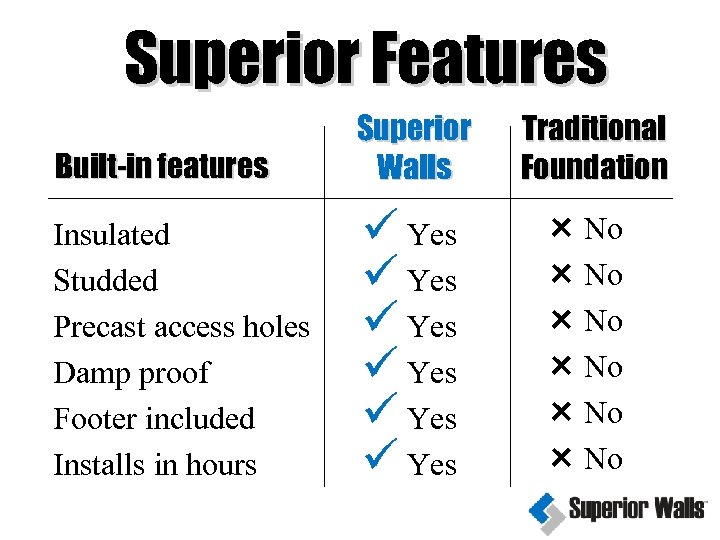 Superior Features Built-in features Insulated Studded Precast access holes Damp proof Footer included Installs in hours Superior Walls Traditional Foundation ü Yes ü Yes Ð No Ð No