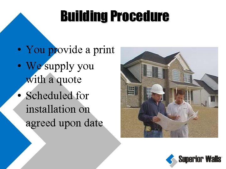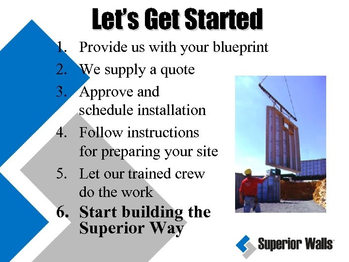 Let’s Get Started 1. Provide us with your blueprint 2. We supply a quote 3. Approve and schedule installation 4. Follow instructions for preparing your site 5. Let our trained crew do the work 6. Start building the Superior Way