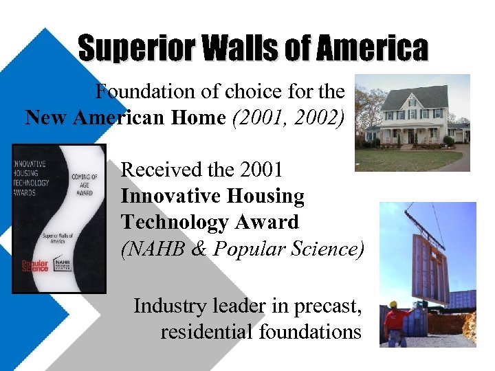 Superior Walls of America Foundation of choice for the New American Home (2001, 2002) Received the 2001 Innovative Housing Technology Award (NAHB & Popular Science) Industry leader in precast, residential foundations