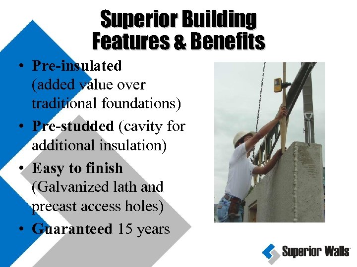 Superior Building Features & Benefits • Pre-insulated (added value over traditional foundations) • Pre-studded (cavity for additional insulation) • Easy to finish (Galvanized lath and precast access holes) • Guaranteed 15 years