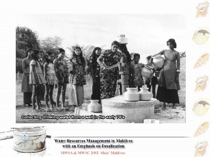 Water Resources Groundwater – private individual wells public mosque wells Rainwater – private rainwater tanks public rainwater tanks Traditionally the population of Maldives has been dependent on shallow wells for its drinking water