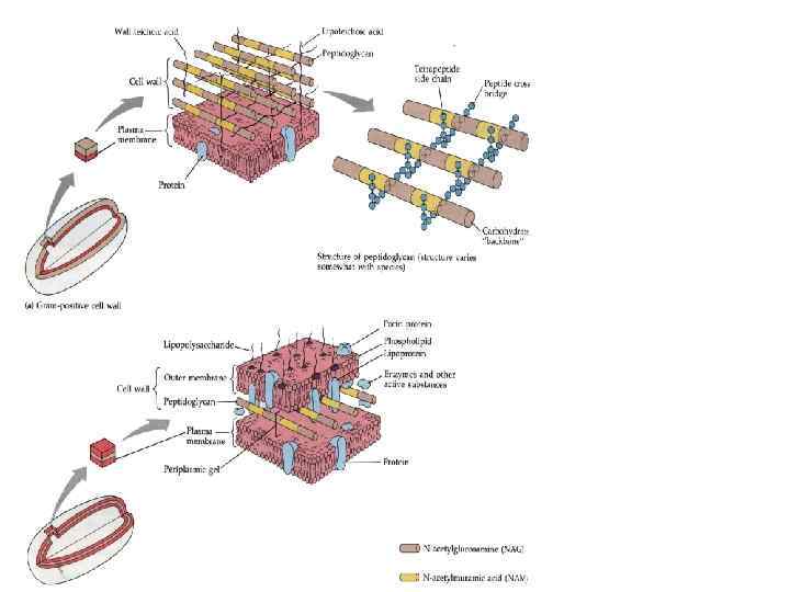 Cell wall The cell wall of the bacterial cell is a complex, semirigid structure The chemical composition of the cell wall is used to differentiate major types of bacteria. Gram-Positive Cell Walls Many layers of peptidoglycan, forming a thick, rigid structure. In addition, the cell walls of gram-positive bacteria contain teichoic acid. Gram-Negative Cell Walls One or a very few layers of peptidoglycan and an outer membrane. The outer membrane of the gram-negative cell consists of lipopolysaccharides (LPS), lipoproteins, and phospholipid